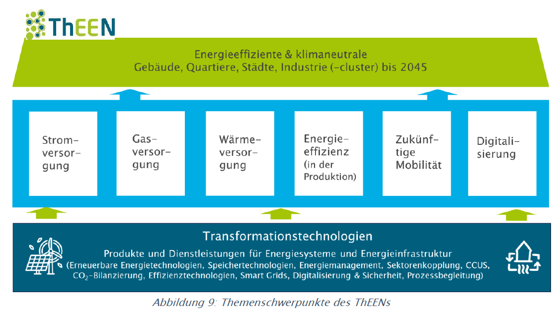 Das Wirkungsspektrum des ThEEN umfasst den gesamten Bereich der Transformationstechnologien (insbesondere Produkten und Dienstleistungen für Energiesysteme) und Energieinfrastruktur.